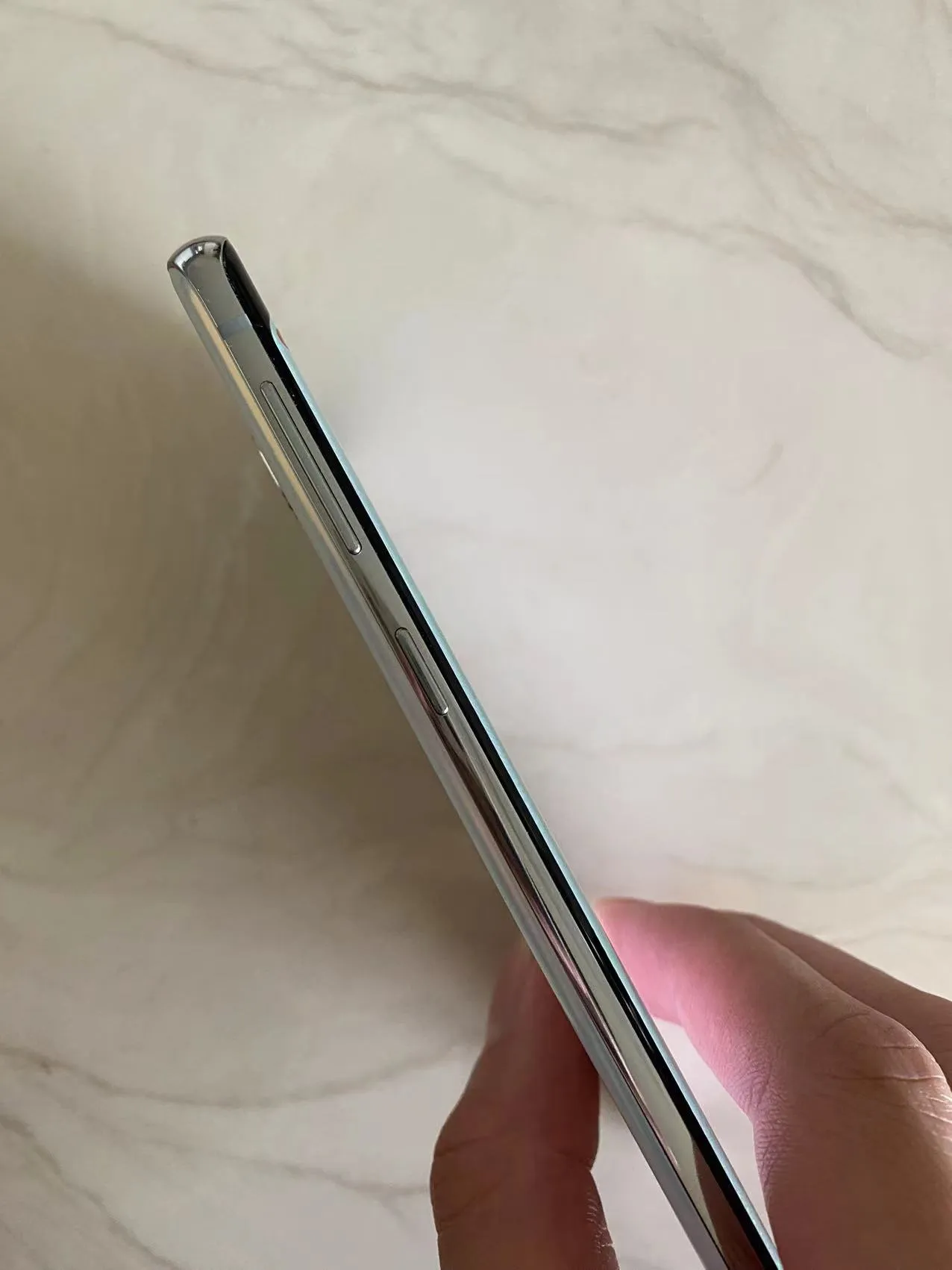 曲面屏幕 轻薄设计 居中摄像头 白色偏浅蓝的背面 反光也是偏红的金色